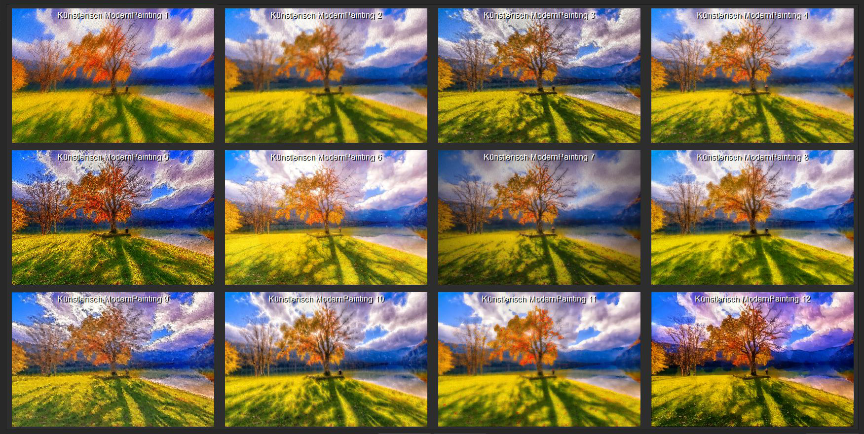 Die zwölf Presets verwandeln Ihre Fotos oder Videos mit nur einem Klick in den Stil moderner Gemälde. Die simulierten Malstile sind Aquarell, Öl oder eine Mischung zwischen Aquarell und Öl mit verschiedenen Pinselstricharten. Zu den verschiedenen Malstilen werden Behandlungen mit Flüssigkeit oder Kalaidoskop-Effekten dazugemischt, was besonders anmutige Gemäldestile erzeugt.